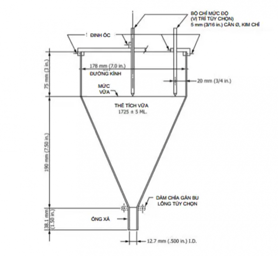 | Thể tích tiêu chuẩn | 1725ml (có kim định vị mức vữa để đảm bảo độ lặp lại thí nghiệm) |